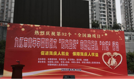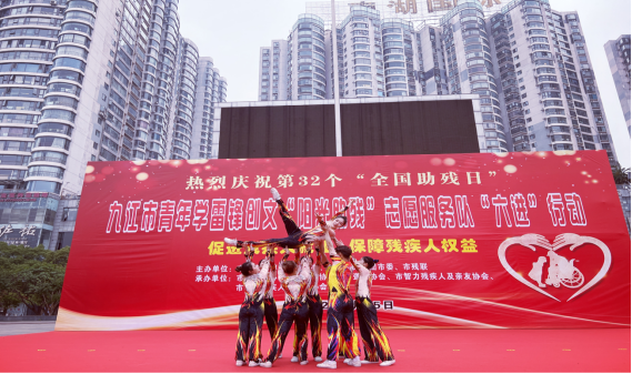2022年5月15日,九江市市委宣传部、市创文办、市文明办、市团委、市残联等部门联合举办了青年学雷锋创文“阳光助残”志愿服务队“六进”行动,申博sunbet健美操队由李娟老师带领八名同学受邀参加本次“阳光助残”活动。