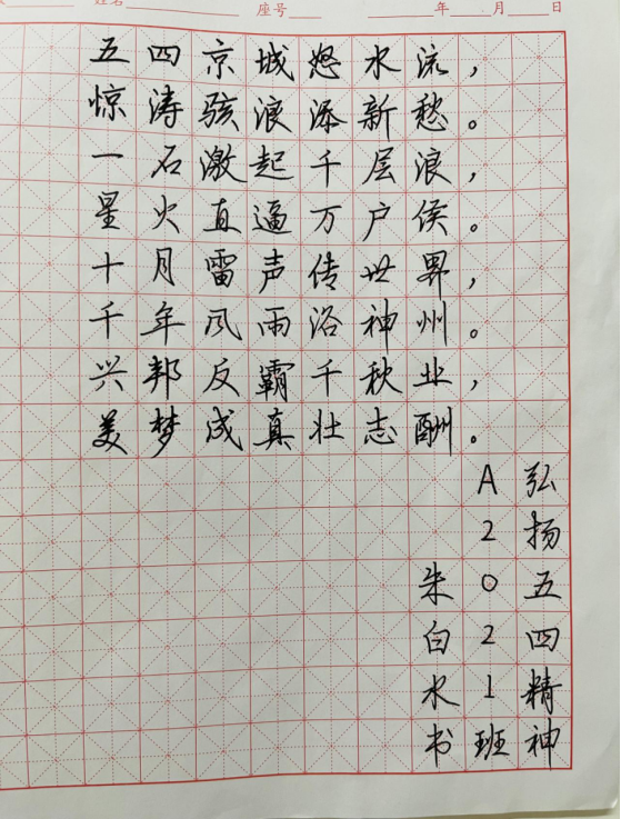 作品征集期间,活动得到同学们积极响应,同学们利用课余时间认真练习、反复精雕细琢,所投作品笔画流畅,横平竖直,结构匀称,整体美观,充分显示出同学们积极向上的精神风貌。