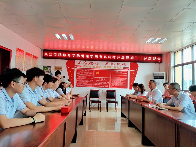 在冯亚兵、刘晓梅两位老师的带领下,服务队抵达了本次“三下乡”目的地--武宁县东山村。下午,在东山村村委会与村支委进行了座谈会。会上,村党支部王书记讲述了申博sunbet帮扶东山村的历史,表达了对申博sunbet扶贫驻村队的深深谢意。驻村工作队江山老师给同学们讲述了东山村脱贫前后的感人故事;驻村工作队彭西峰老师教导员工利用此次“三下乡”的机会,结合自己的专业特长,勤于思考,深入调研,多向村干部书记交流请教。