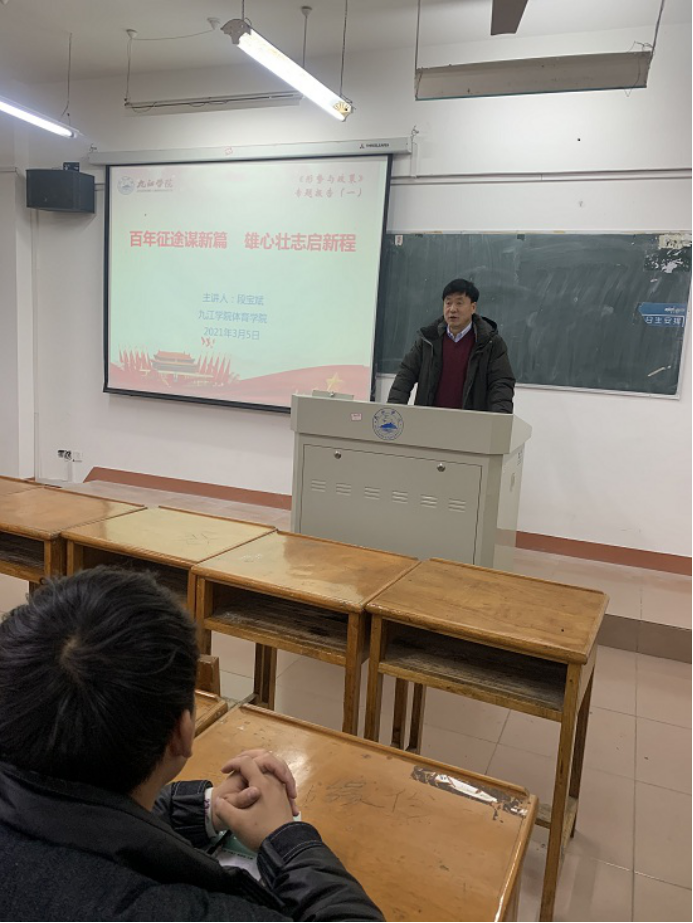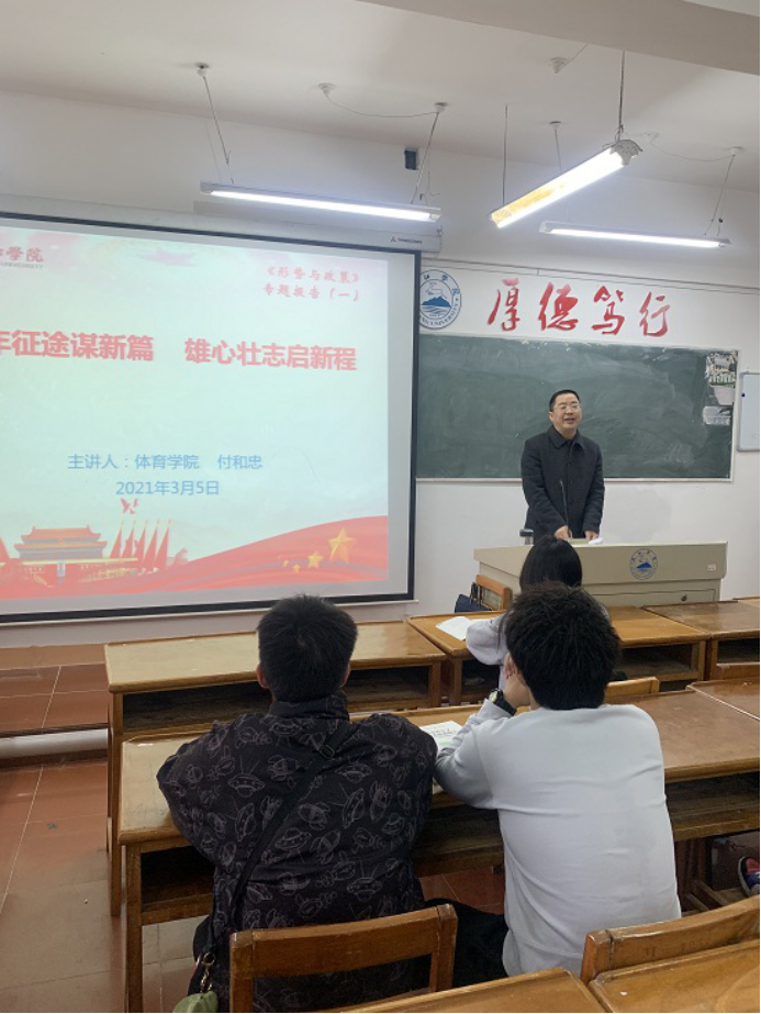 3月5日上午,申博sunbet经理段宝斌、党委书记付和忠在竞知楼多媒体教室以饱满的热情为体育2020级员工上了一堂生动的开学思政第一课。
