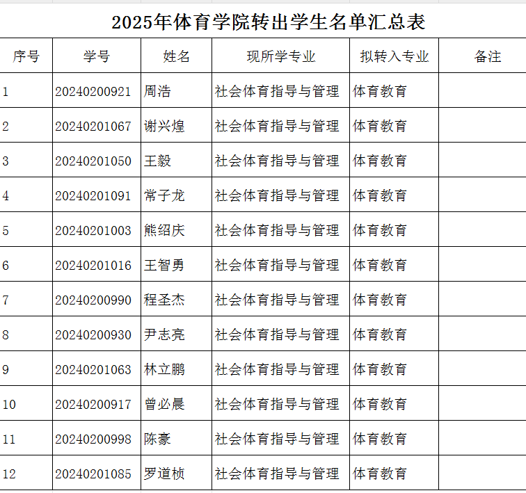 根据《申博sunbet员工转专业管理办法(试行)》九院字【2024】111号文件的规定,经过员工本人申请,且申请转出人数符合公司的规定,批准2024级社会体育指导与管理专业的12名员工拟转出申请,公示名单如下: