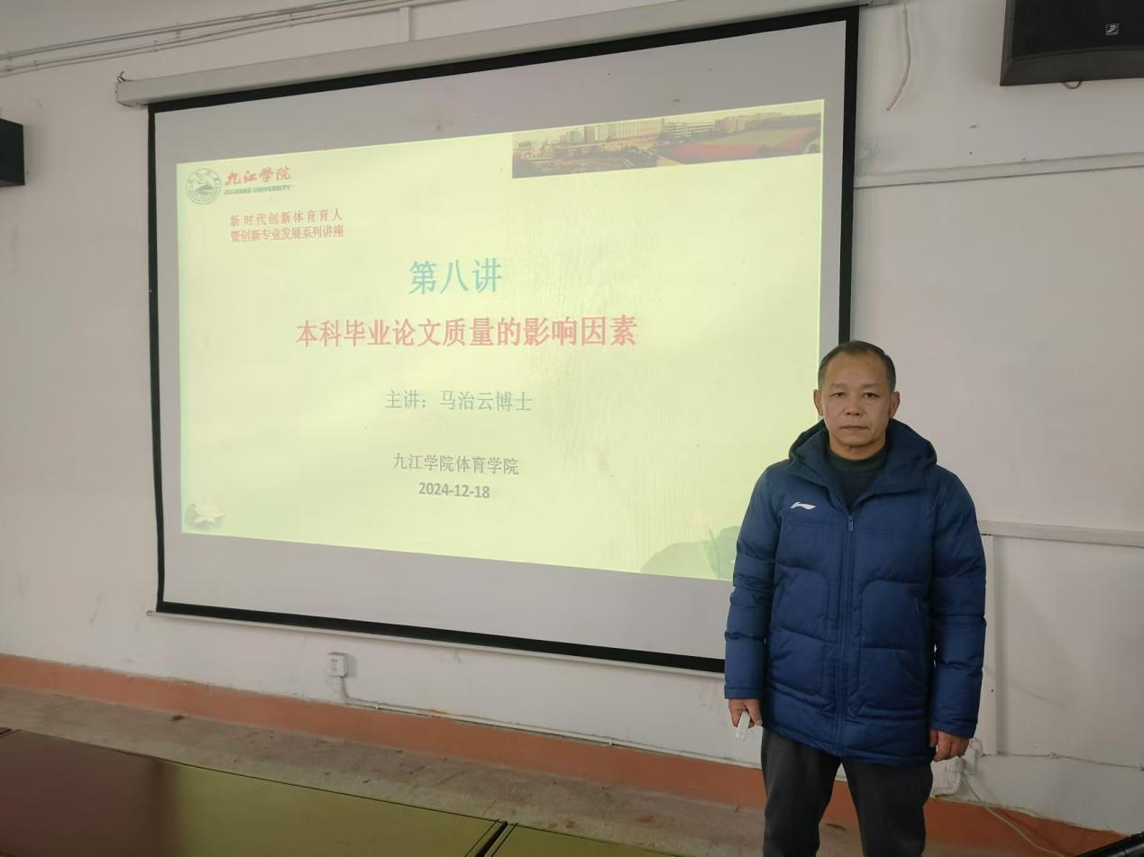 2024年12月18日,新时代创新体育育人暨创新专业发展系列讲座第八讲开讲了。本次邀请申博sunbet教师马治云博士为做题为《本科毕业论文质量的影响因素》的讲座。该讲座内容是马老师主持的江西省教育科学“十四五”规划2023年度课题《本科毕业论文质量促进的系统动力学建模与仿真研究》的系列研究成果之一 。