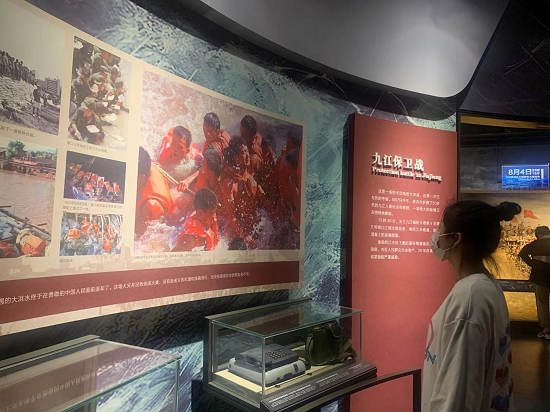 矗立在广场中央的是一座高约20米、镂刻着“1998”字样的纪念碑格外让人警醒,以当年堵口“功臣”——80米长的“甲21025” 号驳船为造型模型的纪念馆庄严肃穆。纪念馆内实景再现的方式让党员同学们身临其境地感受到了九江遭遇九八特大洪水侵袭、抗洪官兵救援群众的军民鱼水情以及封堵决口的壮观场面。