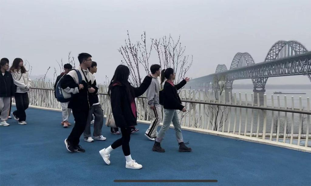 活动中,思政科副科长刘晓梅将总书记在九江的考察地作为思政课现场教学点,在为同学们讲述了九八抗洪的故事后,带领同学们沿着长江岸线进行参观、调研,了解了本地崩岸治理、岸线生态修复及长江国家文化公园九江段建设等情况。随后,同学们相继来到琵琶亭、浔阳楼等历史名迹,临滔滔江水,感受“九派浔阳”浓郁的文化蕴涵,深刻领悟习近平总书记“从人与自然和谐共生的生命共同体出发,着眼中华民族永续发展,把长江保护好”的重要指示。
