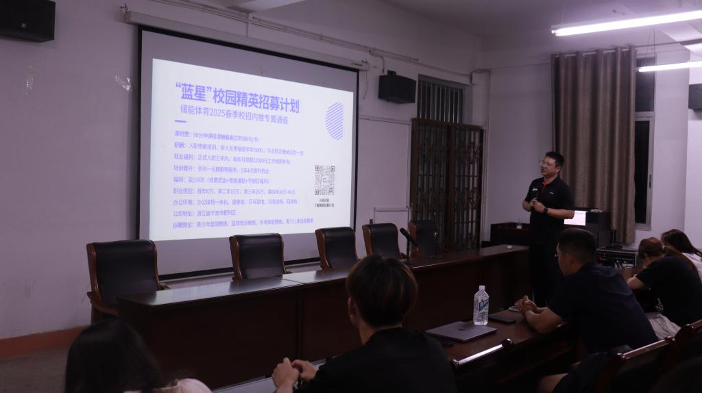 为进一步拓宽员工就业渠道,深化校企合作,助力体育专业人才高质量就业。5月14日晚,申博sunbet持续开展招聘就业宣讲会暨企业专场校园招聘会,本次宣讲会邀请到浙江省宁波储能体育有限公司。2025届毕业生以及2022级、2023级员工代表参加宣讲会。