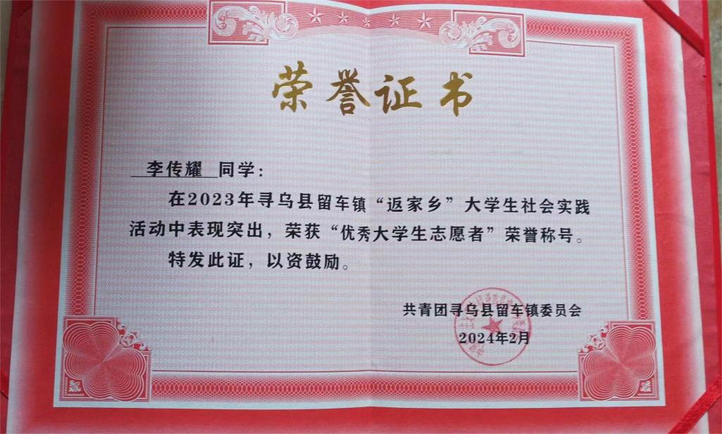 2月1日-2日,A2312班李传耀在赣州市寻乌县留车镇党群服务中心,开展社区环境整治,慰问空巢老人,科普宣传等活动,深入了解家乡在历史文化、经济发展、社会治理等方面发生的巨大变革,为助推家乡的经济社会发展贡献青年力量,并被寻乌县留车镇团委授予“优秀老员工志愿者”荣誉称号。