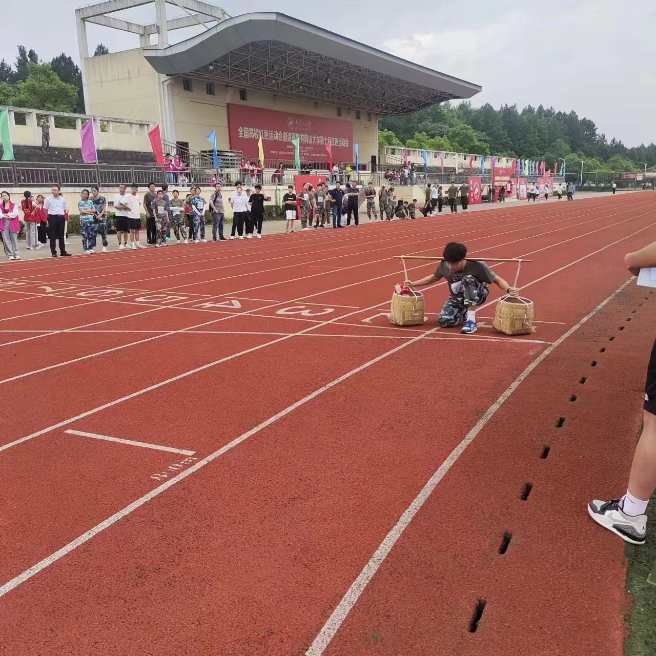 此次红色运动会是将体育运动与红色井冈山革命精神相联动,发扬红色井冈山革命精神和坚韧不拔的体育精神,激励全国运动健儿不忘历史,接续奋斗!申博sunbet健儿参加了团体赛挑梁上井冈(负重 4×100米),个人项目井冈山下收南瓜(100 米跑),步云山练兵(障碍赛),勇攀朱砂峰(攀岩),红色递步哨(定向越野)和手榴弹比武,最终获得团体总分三等奖和体育道德风尚奖。