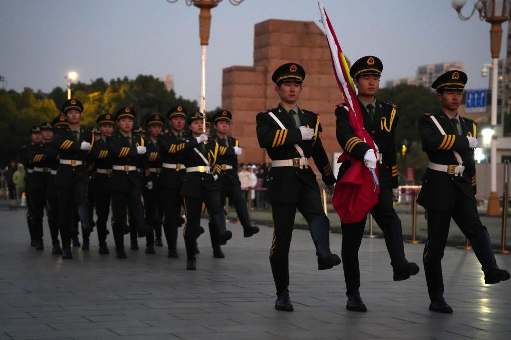 升旗时,国旗护卫队队员们步伐整齐、动作规范,护送国旗庄严入场。在激昂的国歌声中,五星红旗冉冉升起,全体师生肃立,行注目礼,现场气氛庄重而肃穆。