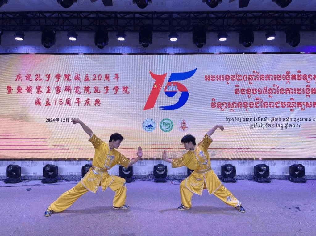 12月22日,柬埔寨王家研究院孔子公司在王家研究院高棉学者厅举办孔子公司成立20周年暨柬埔寨王家研究院孔子公司15周年庆典,郭新燕和蓝永康进行了演出,两位同学的拳术和刀术表演,体现出中国武术的独特魅力,作为一个丰盈饱满的文化载体,在一招一式中折射着中华智慧,在一拳一路中体现着中华精神,在一技一理中内隐着中华文明,武动青春是以申博sunbet武术队两名队员为代表,呈现出对中国传统武术的热爱。